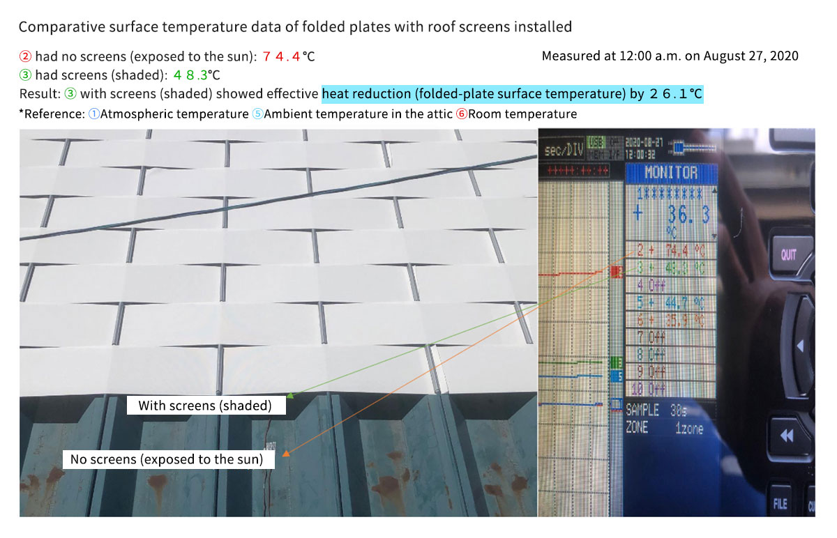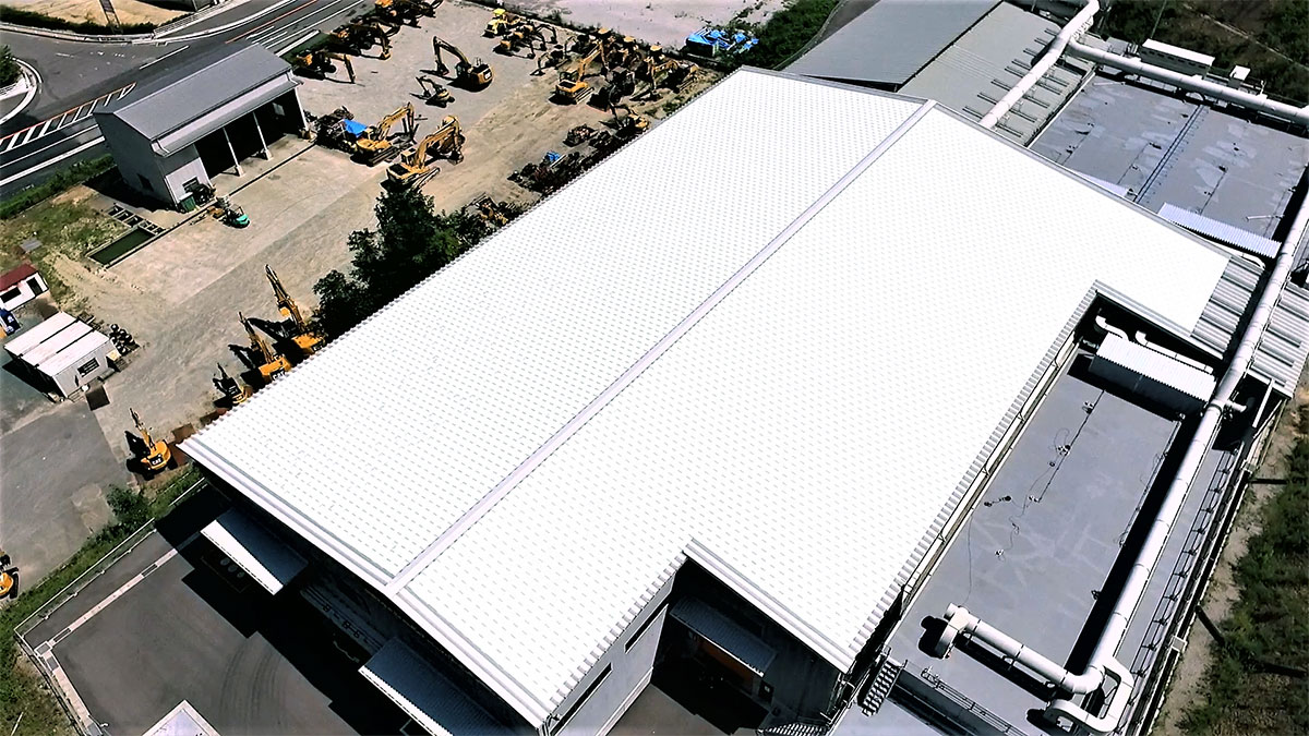Folded-plate roofs that are made of steel tend to heat up during summertime. While it has been reported that their temperature could get up to roughly 80℃ on the hottest day, such high heat atop a building would certainly cause the indoor temperature to rise, resulting in decreased air-conditioning efficiency and possibly harming the health of the workers inside the building.
