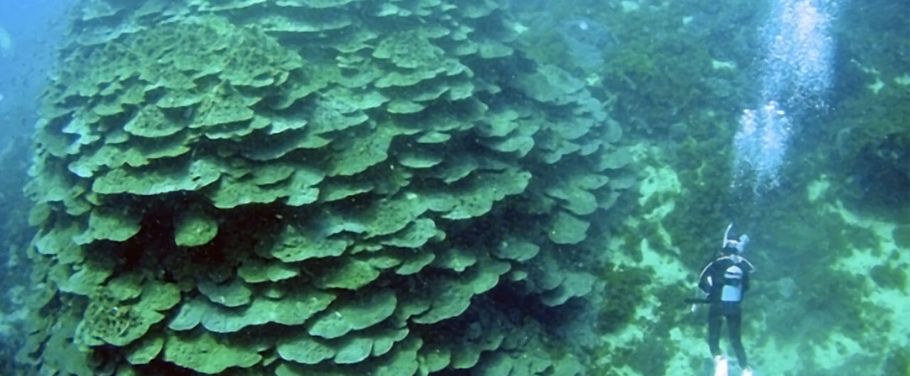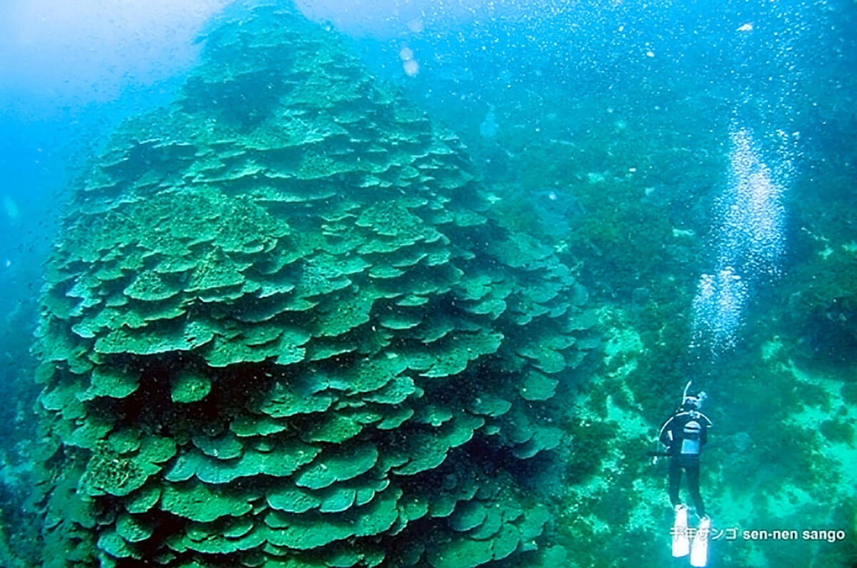 The reason why the Millennium Coral have lived 1,000 years is that it has grown in a quite special environment. First, as the bay of the Oshima island faces north, waves and winds from the south due to typhoons and storms are completely prevented. Second, warm seawater due to Japan Current and seawater rich in nutrients from the Kii Channel flow into the area and they create an environment suitable for growth of various creatures. Third, the island has not been developed and the environment has not been destructed. The Millennium Coral is “miracle heritage” produced under a perfect combination of favorable conditions.
