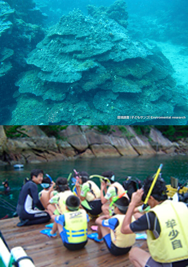 In our recent survey on the environment surrounding the Millennium Coral, several young corals of around 1 m in height. We expect that continuously monitoring the growth of young corals will help find out the environment under the sea of the inner bay of Oshima and detect future changes in the environment. In the shallows near the Millennium Coral, many different creatures can be observed by snorkeling and we invite local children to see those creatures, hoping those children will join activities to protect the sea in the future.