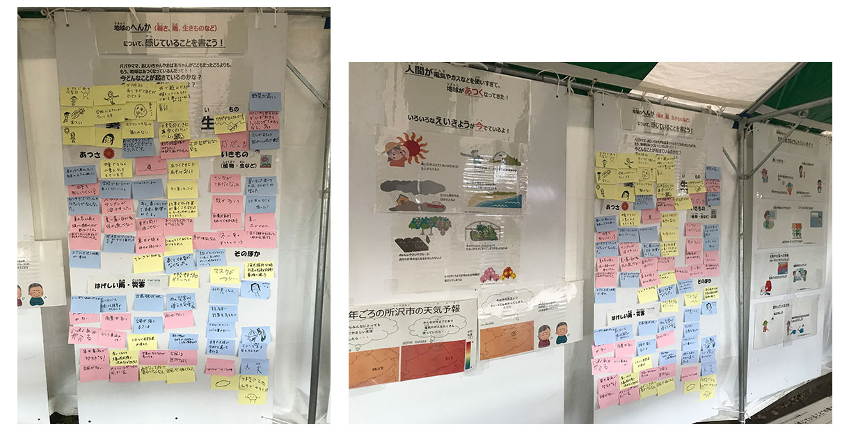 In addition, we held an exhibition on adaptation at the Tokorozawa Citizens Festival, a large-scale annual event in the city. People visiting the exhibition were asked to give a written answer to the question “What changes to the climate have you noticed?” while being shown projections of the average temperature increase in the city area and what climate change impacts are likely, and given information on adaptation measures they can implement by themselves, presented in the form of diagrams and illustrations. I think the content was a little difficult for the children, but I believe it was a good opportunity for them to learn about the concept of adaptation and become familiar with it.