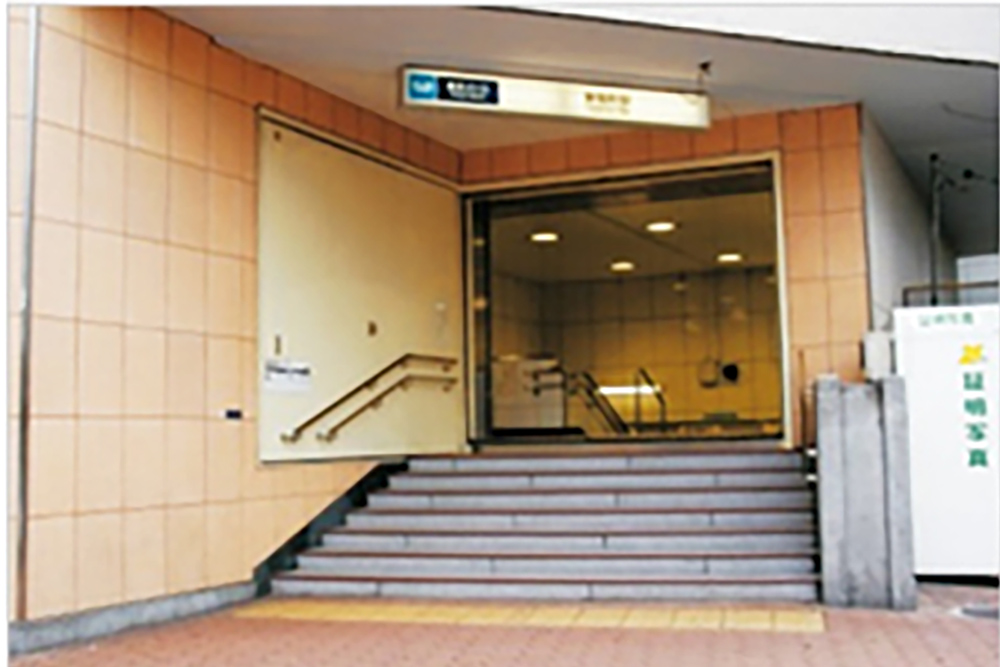 Tokyo Metro has introduced measures against flood damage in the event of typhoons and torrential rains. In addition to elevating the entrances and exits of metro stations above the level of the sidewalk (Fig. 1), barriers (Fig. 2) and watertight doors (Fig. 1) that close the entire entrance have been installed to prevent water from flowing down from ground-level entrances into the stations. Street-level ventilation grates are fitted with sensor-activated anti-flooding devices