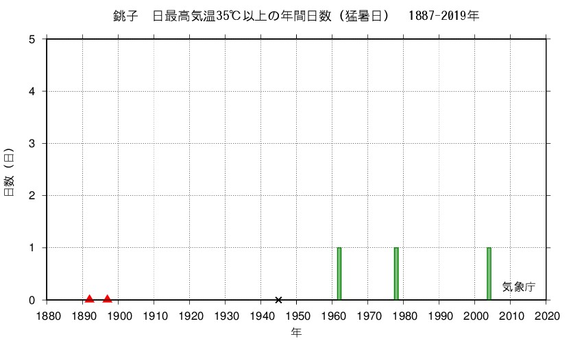 The graph shows the change over time in the number of days per year with a maximum daily temperature of 35°C or more (Extremely hot day).