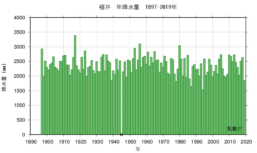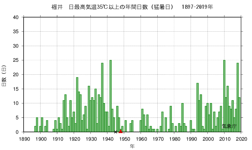 The graph shows the annual variation in the number of days of the year when the daily maximum temperature is 30°C or higher (midsummer day).