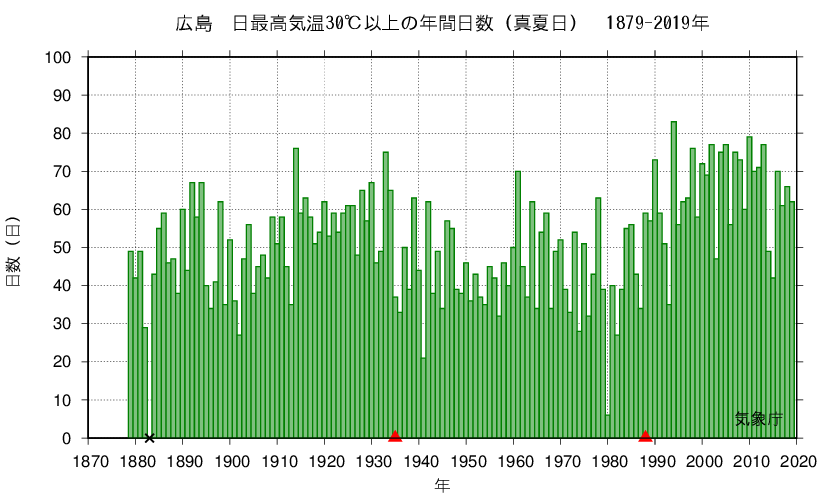 The graph shows the annual variation in the number of days of the year when the daily maximum temperature is 30°C or higher (midsummer day).
