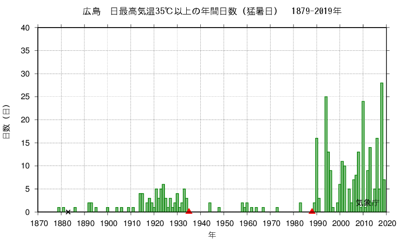 The graph shows the change over time in the number of days per year with a maximum daily temperature of 35°C or more (Extremely hot day).
