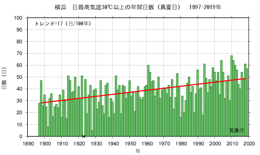 The graph shows the annual variation in the number of days of the year when the daily maximum temperature is 30°C or higher (midsummer day).