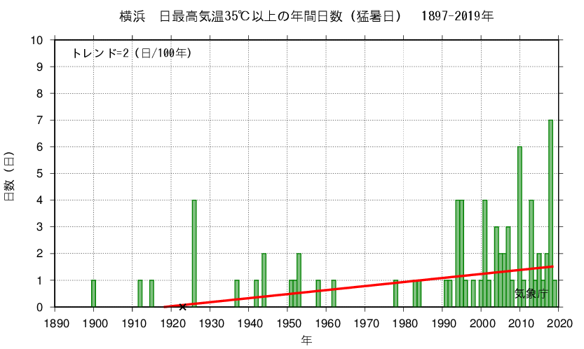 The graph shows the change over time in the number of days per year with a maximum daily temperature of 35°C or more (Extremely hot day).
