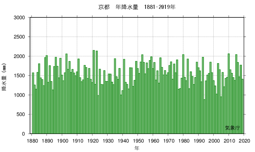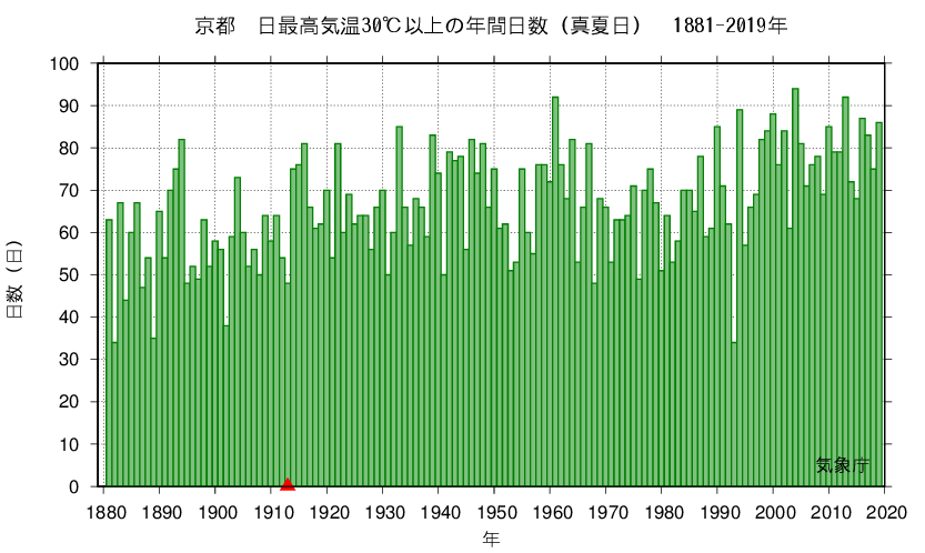 The graph shows the annual variation in the number of days of the year when the daily maximum temperature is 30°C or higher (midsummer day).