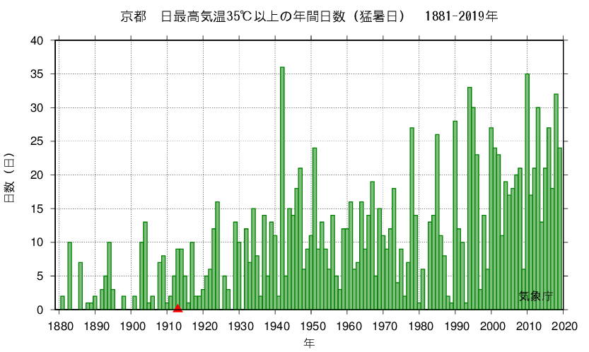 The graph shows the change over time in the number of days per year with a maximum daily temperature of 35°C or more (Extremely hot day).
