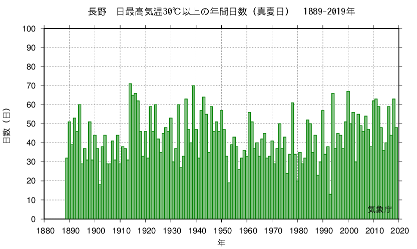 The graph shows the annual variation in the number of days of the year when the daily maximum temperature is 30°C or higher (midsummer day).