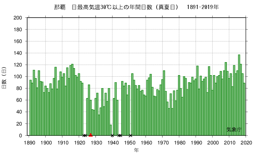 The graph shows the annual variation in the number of days of the year when the daily maximum temperature is 30°C or higher (midsummer day).
