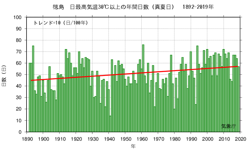 The graph shows the annual variation in the number of days of the year when the daily maximum temperature is 30°C or higher (midsummer day).