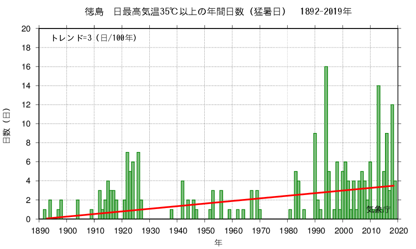 The graph shows the change over time in the number of days per year with a maximum daily temperature of 35°C or more (Extremely hot day).