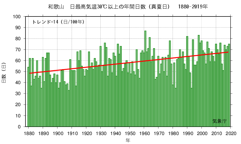 The graph shows the annual variation in the number of days of the year when the daily maximum temperature is 30°C or higher (midsummer day).