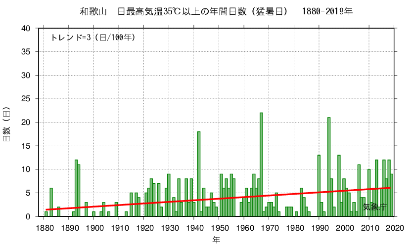 The graph shows the change over time in the number of days per year with a maximum daily temperature of 35°C or more (Extremely hot day).