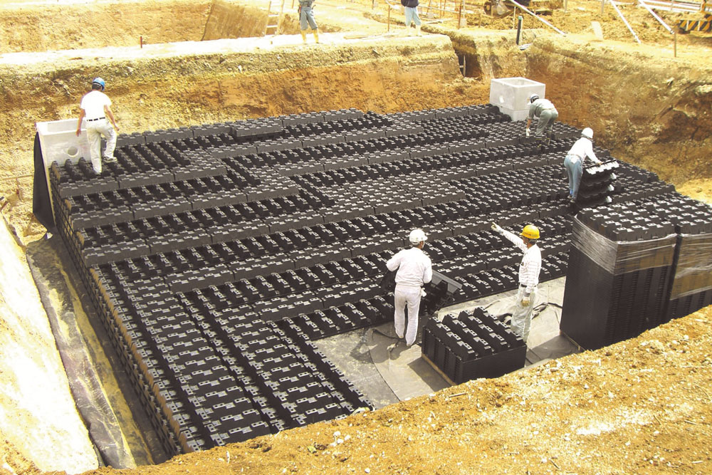 - A rainwater harvesting system that controls the amount of rainwater flowing into sewage and rivers during heavy rainfall, enabling the rainwater to be reused. Rain water is stored in underground water storage tanks, and plastic storage materials are used to reuse or control runoff.