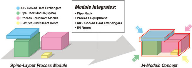 In the modular construction method, a single structure (module) with steel frame, pipe rack, process equipment, etc., is built at a separate location from the construction site (e.g., a shipyard), transported to the construction site by a specific ship, and the plant is completed by joining each module, which significantly reduces on-site working hours. Although it is difficult to predict fluctuations in daily or hourly weather phenomena, it is possible to respond(adapt) to changes by choosing construction methods that are less susceptible to weather conditions, such as planning the on-site construction schedule at a time when the weather is fairly stable. The modular construction method requires complex logistics management and designs including consideration of the ship motion during transportation, but we have met these requirements and have large-scale construction experiences of LNG plants in Russia and Australia. Based on our experiences in designing, procuring, and constructing modules for over 30 years, we propose an integrated module concept J・I・Module® (*1), with a drastic improvement over conventional modular construction methods.