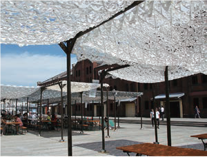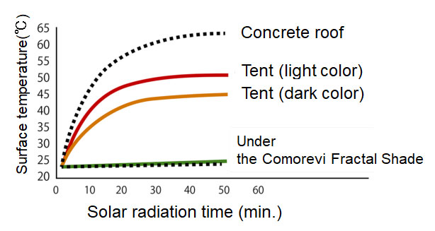 The solar radiation shielding percentage of the Comolevi® Fractal Shade is about 80%. The surface temperature tends to be more than 15°C lower than that of concrete roofs and tents in the area, confirming that it is cooler under the shade than the surrounding area.