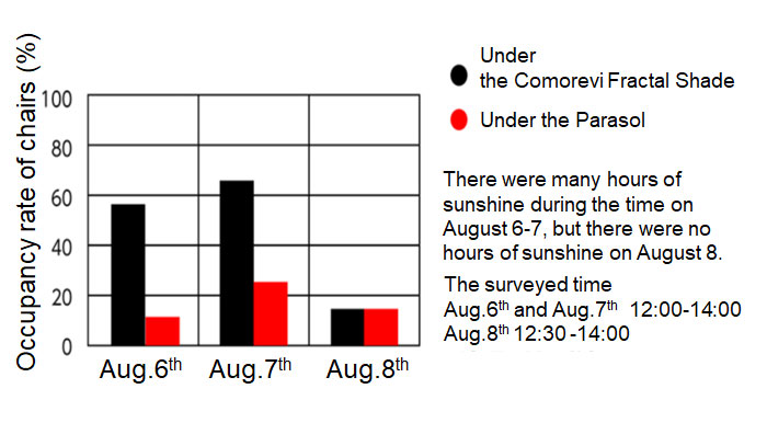 We investigated the occupancy rate of chairs under the Comolevi® Fractal Shade and under the parasol over three days. The chairs under the Comolevi® Fractal Shade was more likely to be used during the hours when the sun was out.