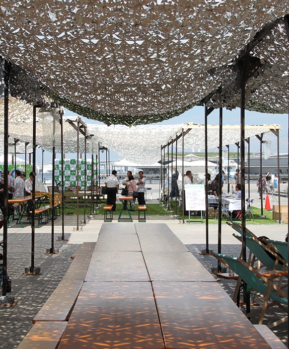 The Comolevi® Fractal Shade is a shade with moderate gaps in between, which was developed from research on the structure of how light passes through trees. It creates natural breeze like the tree shade, and provides a comfortable space without the use of energy or electricity.