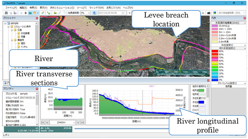 In addition, It is also possible to perform a simulation by inputting the expected situation such as what happens if the river overflows due to heavy rain once in 1000 years and the levee breaches. It is simulated according to Ministry of Land, Infrastructure, Transport and Tourism (MLIT) "Inundation Risk Area Mapping Manual (4th Edition)", and it is possible to obtain high accuracy results.