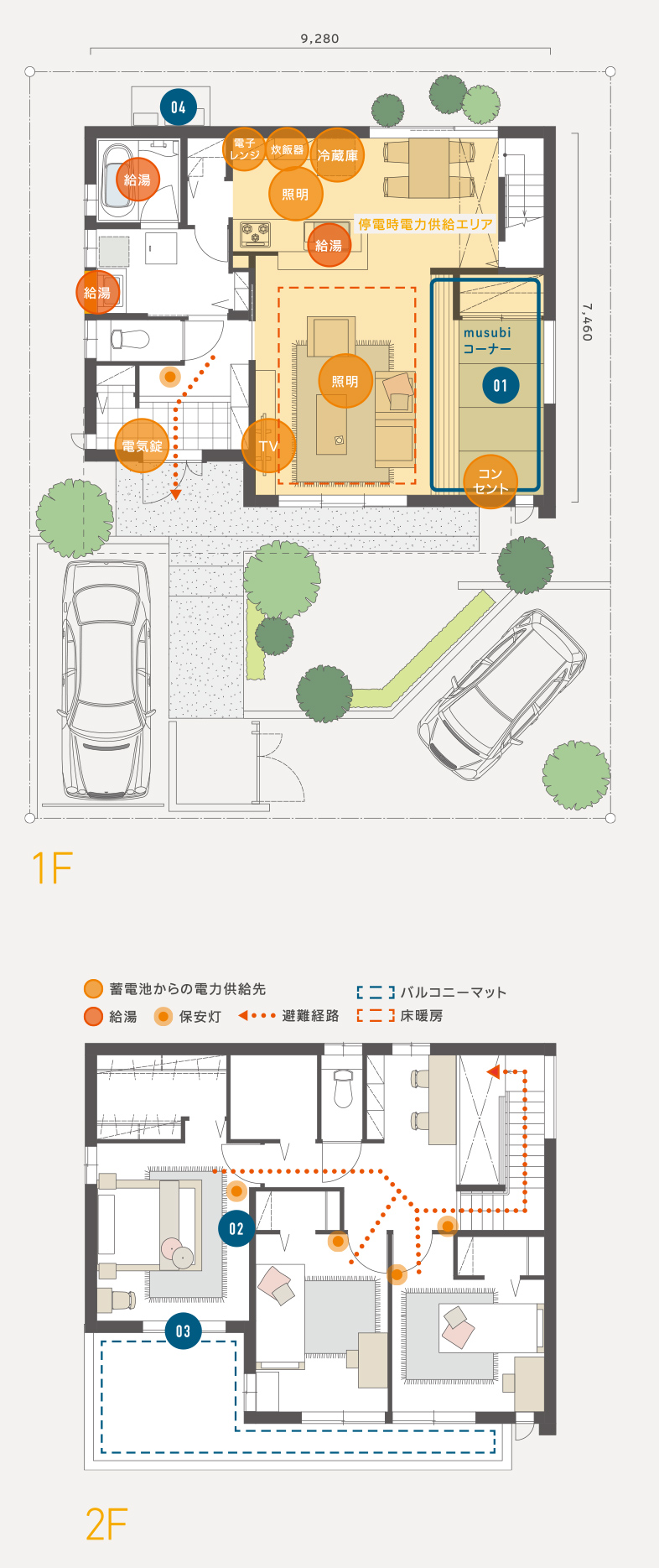 On top of that, by making use of the know-how we have accumulated through our disaster response, we propose disaster-prevention floor plans to reduce stress in times of disasters (Fig. 2). This includes the supply of electricity and heating to the main rooms such as the living room so that families can safely gather even in the event of a power outage during the nighttime, the proposal of “musubi corners” where families can sleep together while obtaining information of the disaster on TV, and the installation of security lights along evacuation routes to secure the lights along evacuation routes.