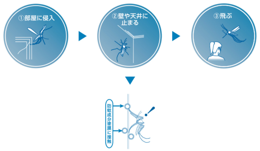 We developed the mosquito prevention paint, Kansai Anti-Mosquito Paint, using the habit of mosquitoes to rest on walls and ceilings. The synthetic pyrethroid component in the paint has an insecticidal effect by acting on the nerve system of mosquitoes, and the effect is exerted when mosquitoes stay on the wall surface with the anti-mosquito coating (Fig.1). The anti-mosquito effect lasts for at least 2 years. Since most mammals including humans can decompose and excrete the components, there are no safety issues, and the product can be used in a wide range of places including homes, public facilities, and commercial facilities.