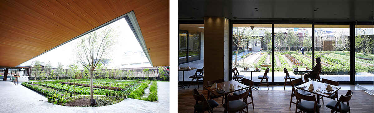The main building of Kyoto Yaoichi, which features specialty food stores focusing on vegetables, has developed a full-scale farm on its third-floor rooftop using soil from Tamba, Kyoto. The rooftop greening is expected to reduce building temperatures and prevent deterioration by blocking direct sunlight, and because it is located right in front of the restaurant on the same floor, visitors can see how seasonal vegetables are grown. This is an advanced example of not only reducing environmental impact but also creating added value by attracting visitors and promoting agriculture (Fig. 2).
