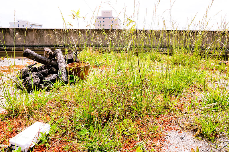 - Okujyo Harappa® (green roof): A new rooftop greening design utilizing the grassy areas (such as vacant lots in urban areas,) which have been decreasing in recent years, and maintaining them by the participation of the residents using nearby vegetation and everyday waste materials. Compared to the conventional rooftop greening designs that use tall trees and shrubs with automatic irrigation systems installed, this new rooftop greening design is environmentally friendly, low-cost, and lightweight. Since seeds are collected from the surrounding area to restore the grass unique to the region, it can create new grass on urban rooftops that matches the characteristics of each region and contribute to the preservation of biodiversity (Fig. 4).