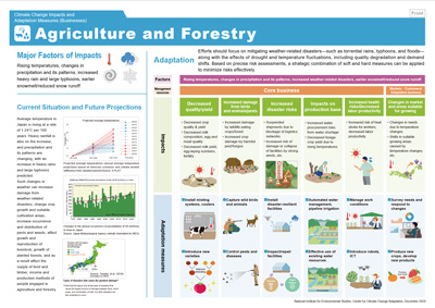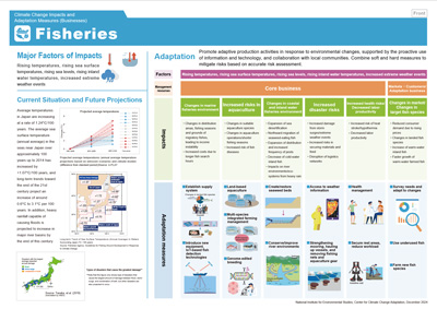 The primary adaptation measures for private sectors are organized by industry, and by items that are common to multiple industries. The flow of the infographic's composition is as follows: "Factors of impacts => Current situation and future projections => Adaptation measures," with easy-to-understand explanations using illustrations on the front and more details on the back. Please use this to promote adaptation measures in your business activities.