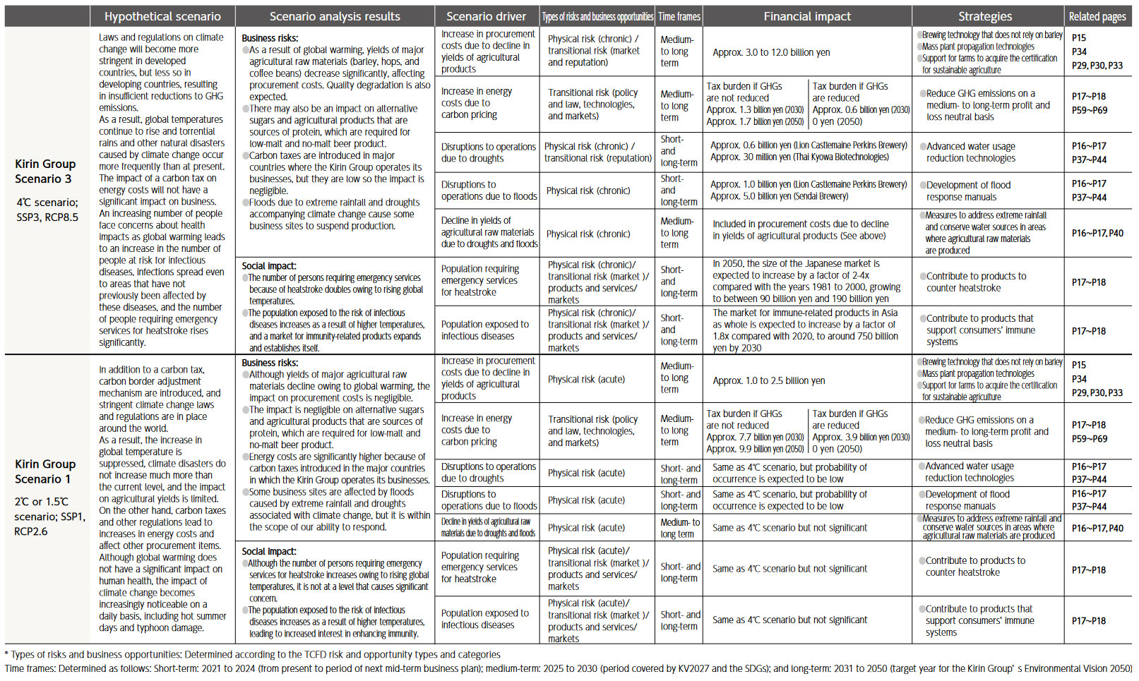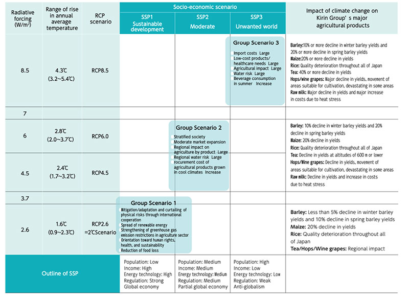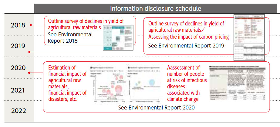 In 2019, for two of the three group scenarios that corresponds to RCP2.6 and RCP8.5 (Note 3), we assessed: the impact on agricultural raw materials in 2050 and 2100, water stress/water risk surveys at agricultural production sites, production and distribution facilities, and the financial impact of carbon pricing.