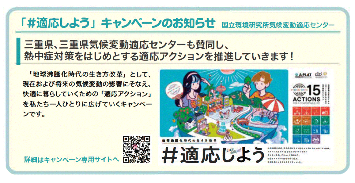 「地球沸騰化時代の生き方改革」として、現在および将来の気候変動の影響にそなえ、快適に暮らしていくための「適応アクション」を国民一人ひとりに広げていくキャンペーンです。