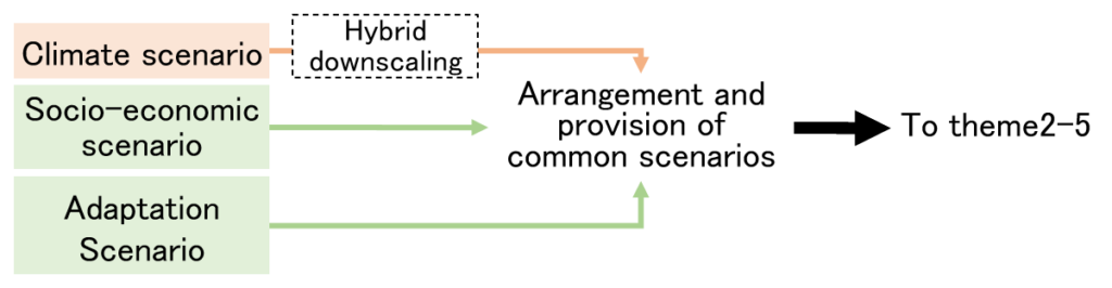 Sub-theme 1(1) will make best use of the latest climate and socio-economic scenarios as common scenarios for the S-18 project. We will then provide the common scenarios for each Theme. In order to meet the individual demands of Sub-themes, a high-resolution climate scenario will be prepared by hybrid downscaling of both statistical methods and mechanical methods using regional climate models. We will create adaptation scenarios, including the types of adaptation measures, combinations of options for each sector and more, in cooperation with all Themes and Sub-themes.
