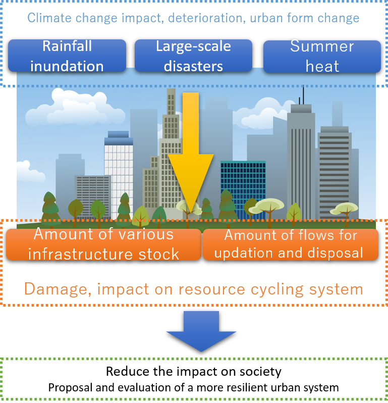- To clarify the spatiotemporal impact of more severe climate change on buildings and infrastructure facilities (and the impact on establishing a sound-material cycle society, etc.).