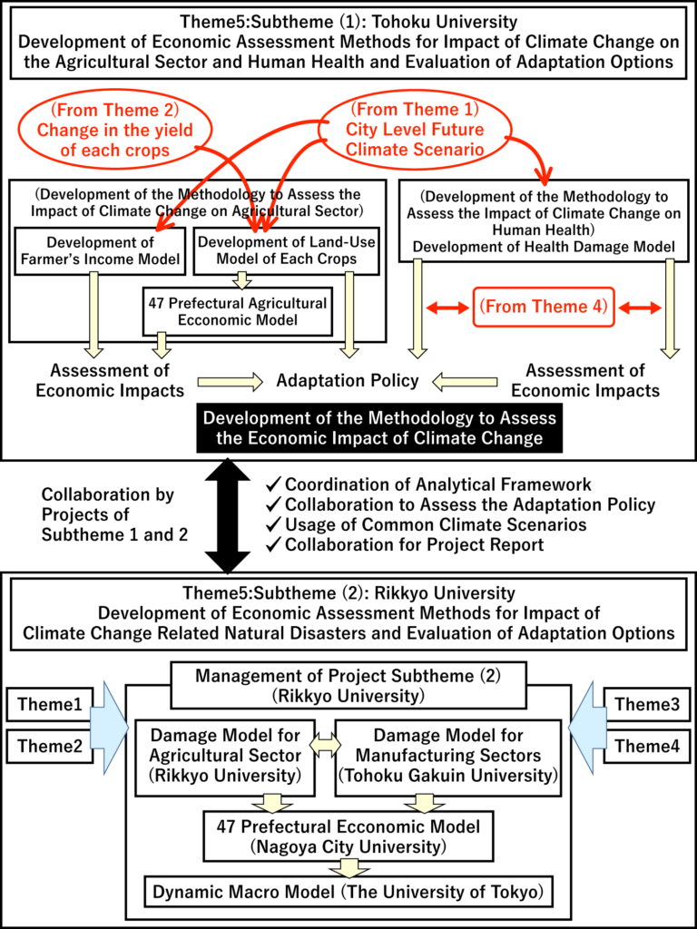 This project consists of two sub-projects: sub-theme 5(1) Development of Economic Assessment Methods for Impact of Climate Change on the Agricultural Sector and Human Health and Evaluation of Adaptation Options and sub-theme 5(2) Development of Economic Assessment Methods for Impact of Climate Change Related Natural Disasters and Evaluation of Adaptation Options.