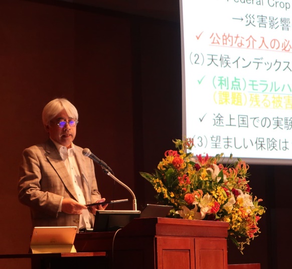 風間 聡教授(東北大学)は日本における洪水の適応策と緩和策を防御(堤防など)、受容(高床、田んぼダムなど)、撤退(防災集団移転、土地利用規制など)に分けて、評価を行った結果を発表した。