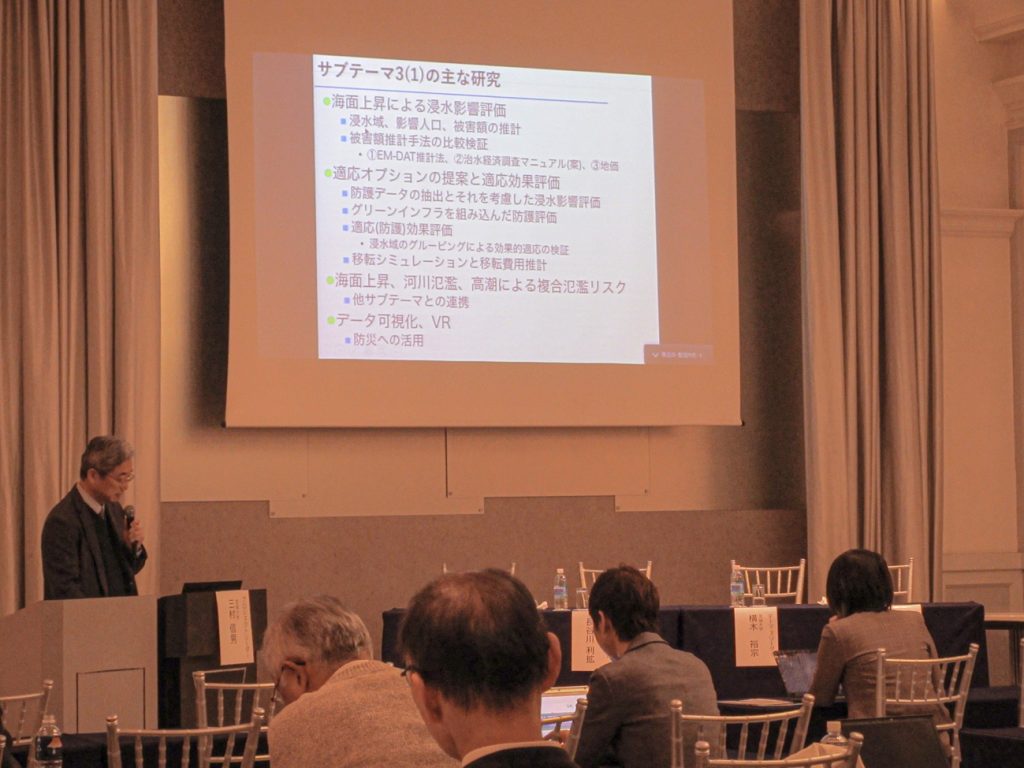 自然災害・沿岸域における気候変動の影響予測と適応策についての研究テーマを担当した横木TLは、高潮による影響人口が最大になるのは21世紀末ではなく2050年頃になるという予測など、適応策の実装が喫緊の課題であることを示す研究結果を紹介しました。気候変動と合わせて人口減少・高齢化が並行して進むことによる、自然災害・沿岸域への影響を把握したという点が本テーマの大きな成果であり、適応策を考える上で重要な視点を提供します。
