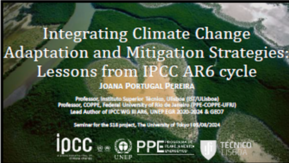 S-18研究プロジェクトでは、一般の皆様も交えて広く気候変動問題を考えることを目的にシリーズでS-18セミナーを開催しております。第12回目となる今回は、リオデジャネイロ連邦大学(UFRJ)およびリスボン大学(ULisboa)のJoana Portugal Pereira氏をお招きし、気候変動への適応と緩和戦略の統合:IPCC第6次評価報告書(AR6)サイクルからの教訓についてお話いただきました。報告と当日の資料を以下に掲載いたします。