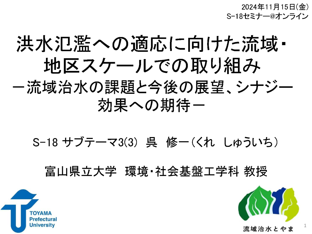 S-18研究プロジェクトでは、一般の皆様も交えて広く気候変動問題を考えることを目的にシリーズでS-18セミナーを開催しております。第13回目となる今回は、本プロジェクト、サブテーマ3(3)のメンバーの富山県立大学の呉 修一氏をお招きし、これからの流域治水の取り組みについて、解説していただきました。報告と当日の資料を以下に掲載いたします。