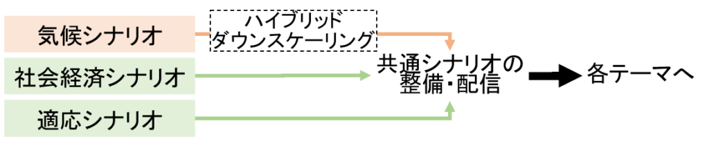 - 本サブテーマでは、個別の適応策は対象としていないが、各テーマ・サブテーマと協力して、適応策の種類、組合せ等を検討し、適応シナリオを構築する予定である。