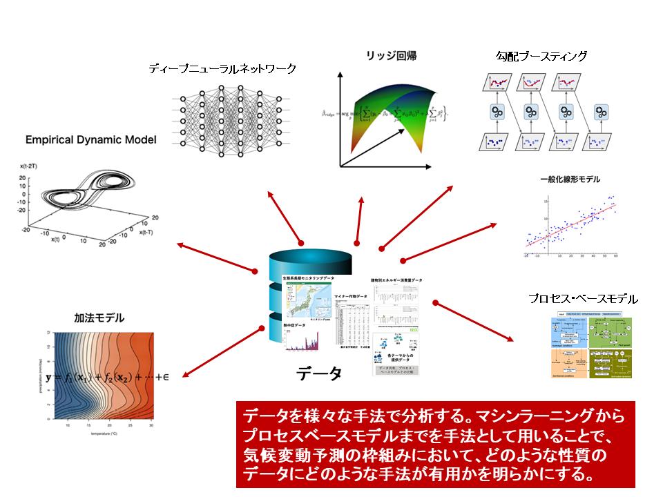 農業、森林・林業、水産業、水環境・水資源、自然災害、産業活動、国民生活などの分野に関して、統計的手法と機械学習的手法によって気候変動の各分野への影響の関係性を明らかにするデータ・ドリブンで統合的な応用解析手法を開発する。不確実性も定量化しながら全国レベルで影響評価を行う。統計的な手法を用いて、気候変動に対する適応策の効果を評価する。一連の知見をマニュアルとして整理し、様々な地方自治体関係者が将来の気候変動影響を統計的に解析するための基盤を作る。