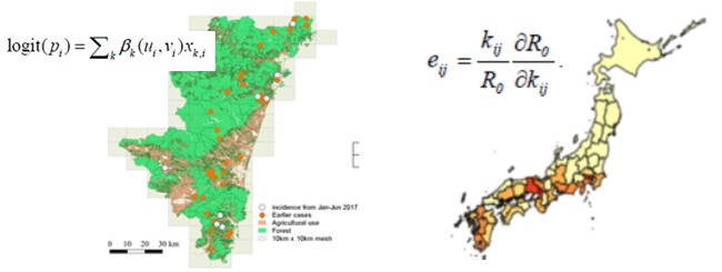 蚊媒介感染症ではデング熱とマラリア、ダニ媒介感染症では重症熱性血小板減少症候群に関する教室内独自のリスク評価研究(モデリング研究) - 気温、湿度、輻射熱、土地利用などを予測因子とした熱中症の予測モデリング
