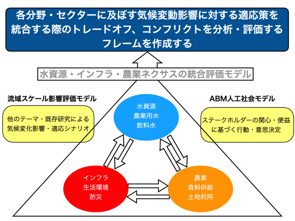 水資源、インフラそして食料(農業)はわれわれの生存・生活にとって最も基本的かつ重要な資源である。しかしこれらの資源利用は相互に依存関係にあり、一方を追求すれば他方を犠牲にせざるを得ないというトレードオフ関係、あるいは資源を利用するステークホルダー間の対立(コンフリクト)が存在する場合がある。そして、このような状況は気候変化によってますます圧力がかけられている。それぞれの資源利用に対する気候変化や社会経済変化が及ぼす影響については、これまで多くの研究がされてきており、それらに対する適応計画も模索されている。しかし、水資源、インフラ、農業の連環・相互作用(ネクサス)を考慮した気候変化影響の評価ならびに適応計画の策定についての研究はいまだ緒についたばかりである。