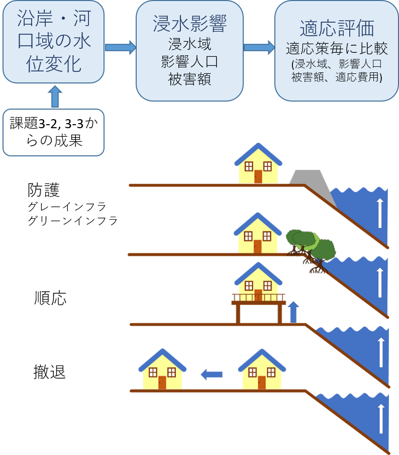 適応評価では、様々な適応オプションを提示するために、物理的な適応効果評価および適応費用評価を行う。適応オプションについては、グレーインフラ、グリーンインフラを組み合わせた防護の効果評価に加えて、人口減少下での順応、撤退なども含めた様々な適応オプションについてその効果および費用を算定する。さらに研究期間の後半には他サブテーマの知見や成果をも踏まえて、浸水・渇水影響の直接的な被害額と適応費用を算出し、複合的な影響予測と相乗効果を生む適応策を検討する。