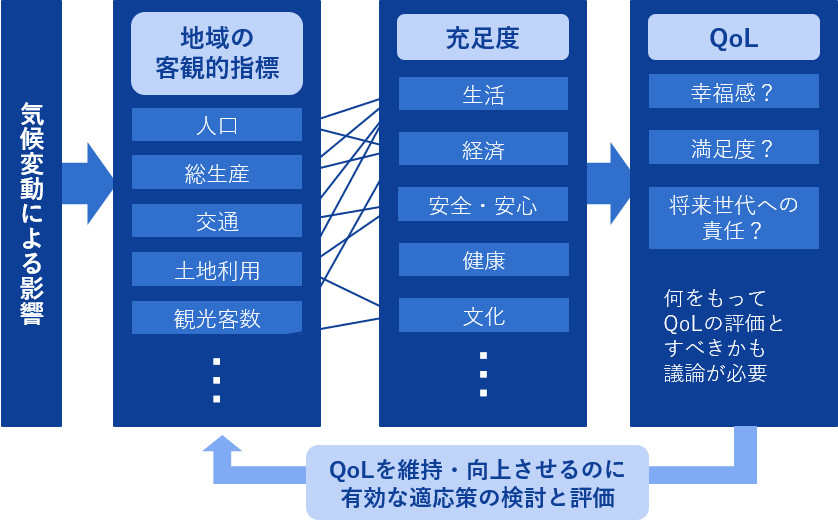 - 気候変動が生活の質に与える影響を予測し、様々な適応策の効果を評価する