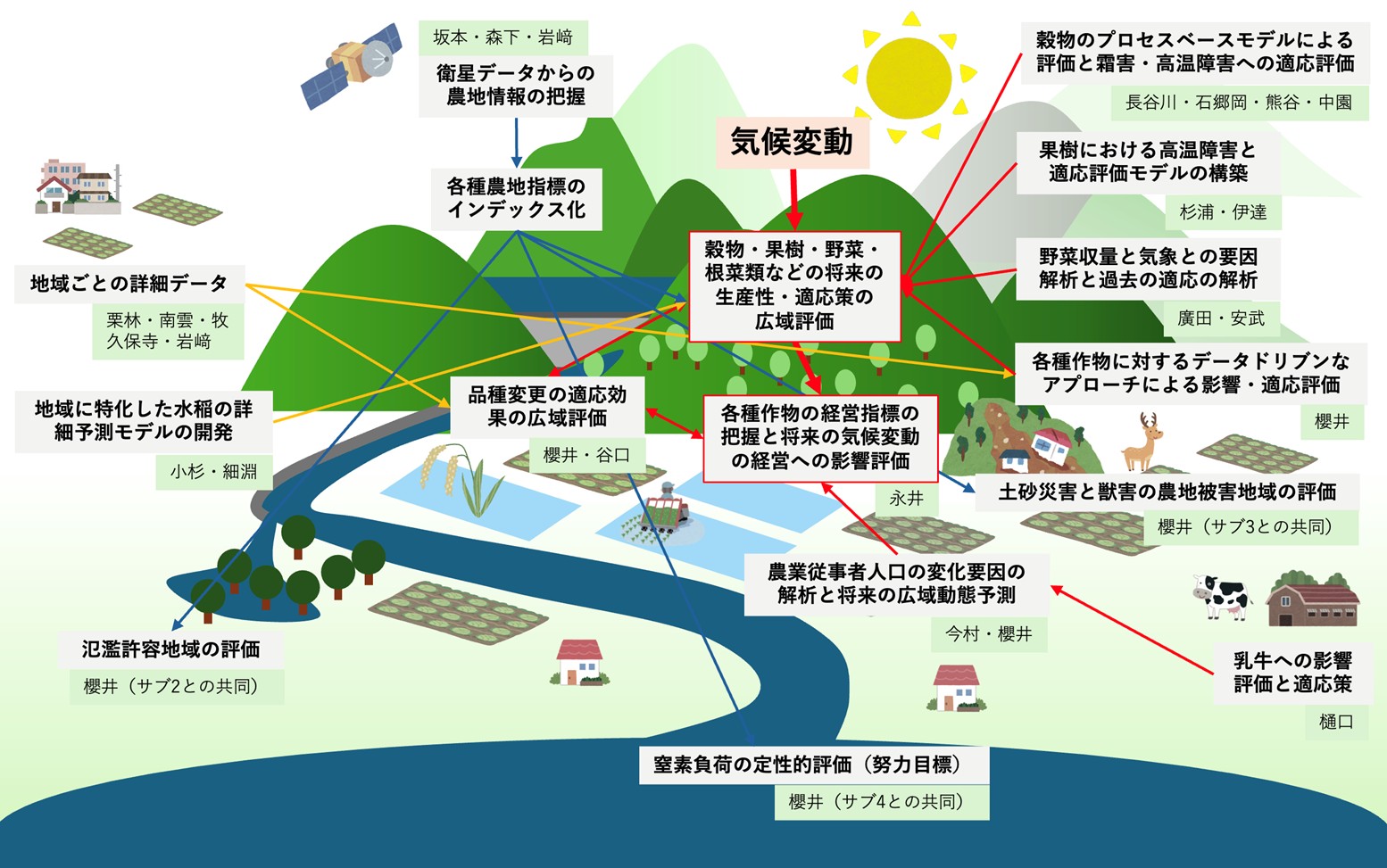 - 複数作物・品種や農業・家畜経営を包括的に捉えたうえでの適応策を評価・提案する。