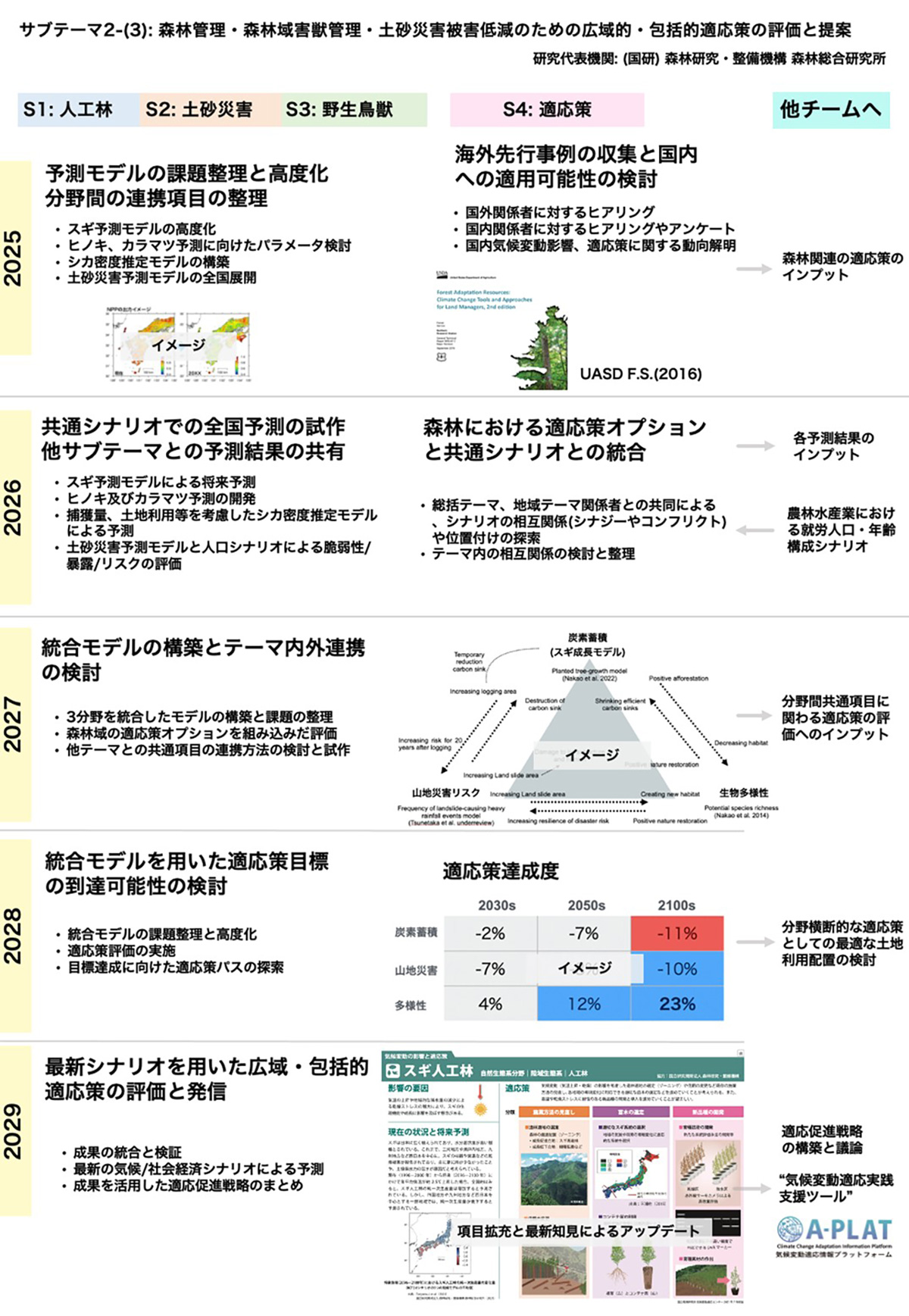 - 気候変動及び人口減少時代における森林管理策を創出し、他サブテーマと共同し地域単位における包括的な適応策の提案