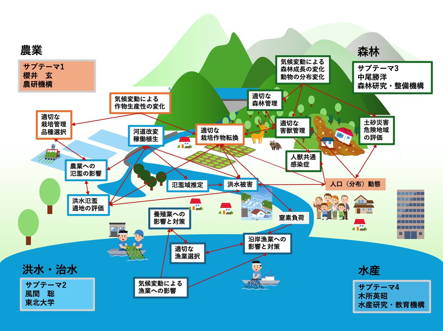 気候変動は農業や洪水、森林、水産業に大きな影響を及ぼし、それぞれの分野で研究が進められてきた。しかし適応策は個別に議論されるのではなく、地域という単位で分野横断的に統合して考える必要がある。たとえば洪水被害は強度だけでなく土地利用にも依存し、農業においても品種開発に加え洪水リスクや最適栽培地域を考慮することが重要である。本テーマでは、農業・河川・森林・水産業の知見を統合し、高解像度かつ経済的視点から適応策を評価する。そのうえで、相乗効果やコンフリクトを分析し、包括的な地域適応策を提示する。人口減少と気候変動という現実的課題に対応するシステムチェンジも視野に入れ、実践的な適応への足がかりとなる研究を目指す。