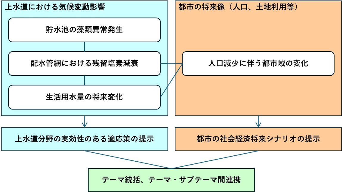 - 貯水池の藻類異常発生、配水管網における残留塩素の減衰、気象要素の影響による生活用水量の将来変化を予測するモデルを構築し、将来の影響評価を行う。その際、将来の人口減少やそれに伴う社会変化も考慮する。
