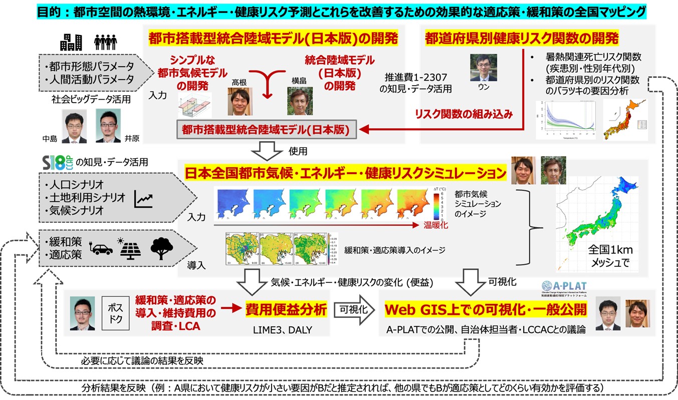 - 日本全国の都市を解像可能な都市搭載型統合陸域モデル(日本版)を開発し、このモデルに都道府県別の暑熱関連死亡リスク関数を取り込むことで、全国の都市の暑熱環境・健康リスクの予測および適応策・緩和策の導入効果を定量化する。